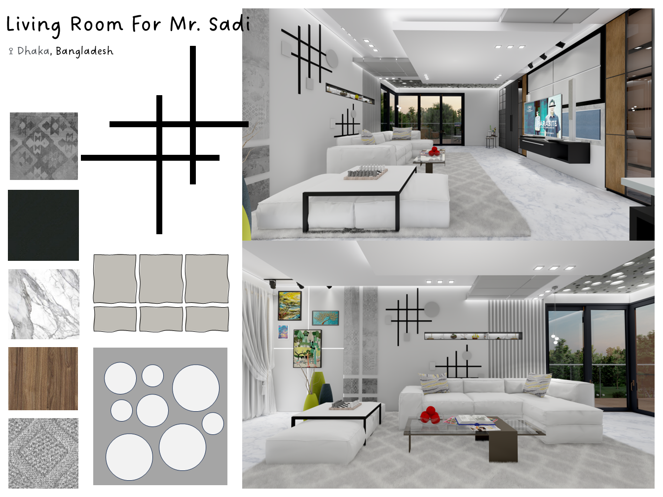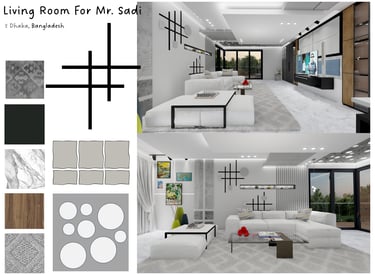 Mr. Sadi, our prominent client, entrusted us with his living room design. Our esteemed construction company, ADORA Studios, brought this formal and elegantly furnished space to life. The living room is characterized by its light color palette and tasteful selection of furniture. Soft, plush sofas and armchairs are arranged around a sleek coffee table, creating a cozy seating area for family and guests. The windows are adorned with light curtains, allowing natural light to fill the room and providing a welcoming atmosphere. The walls are decorated with elegant paintings and decorative accents that add a touch of sophistication to the space. Mr. Sadi's living room is a perfect blend of comfort and refinement, where he can relax and entertain with style.