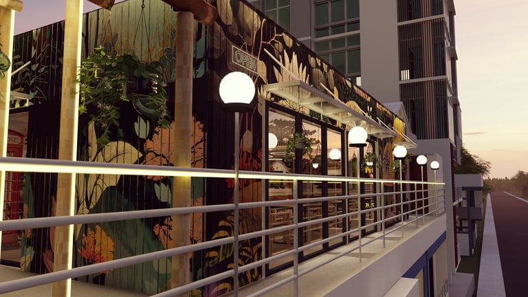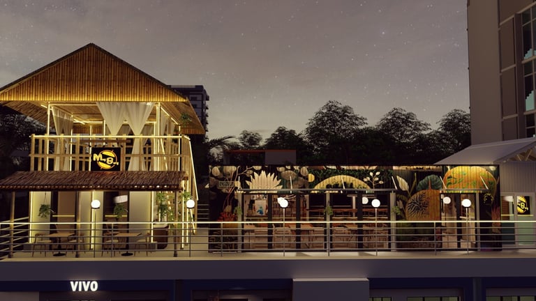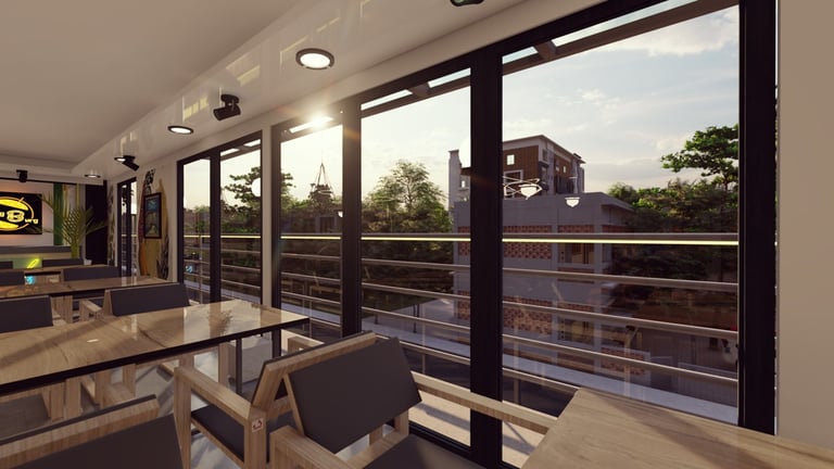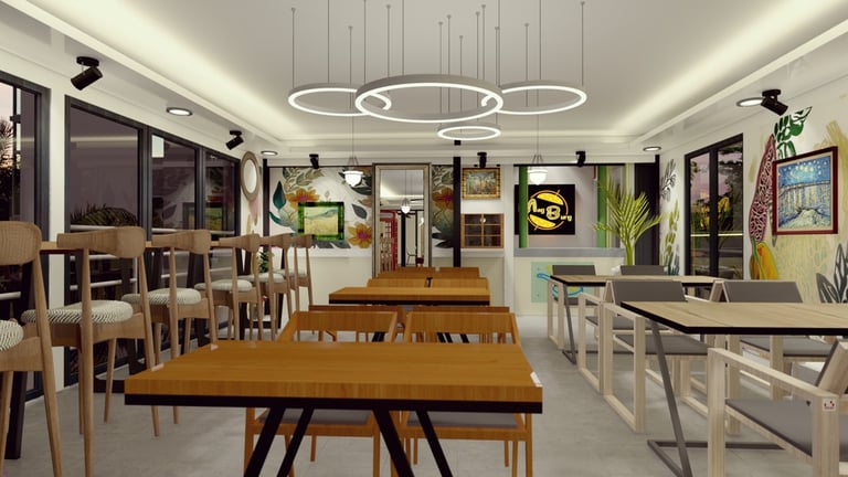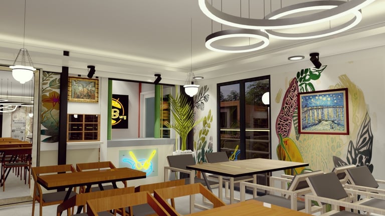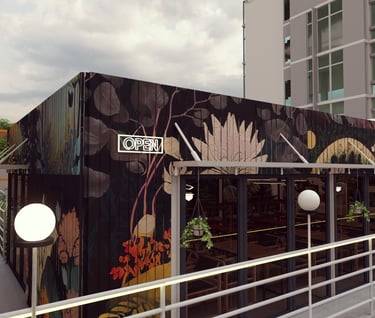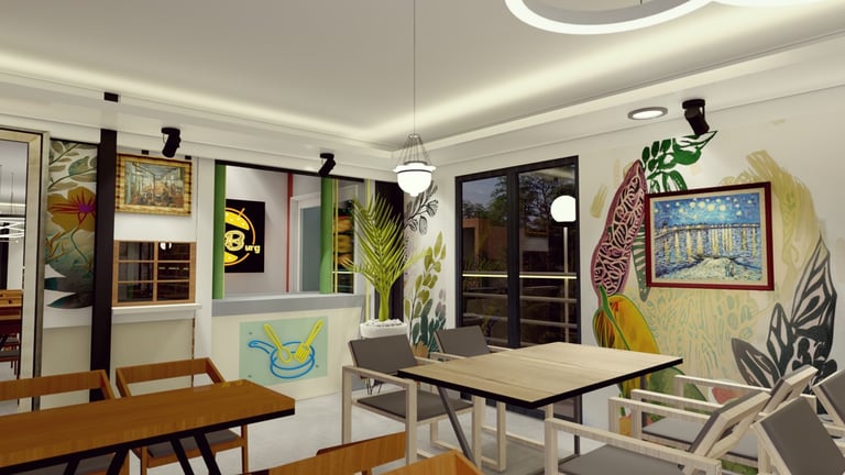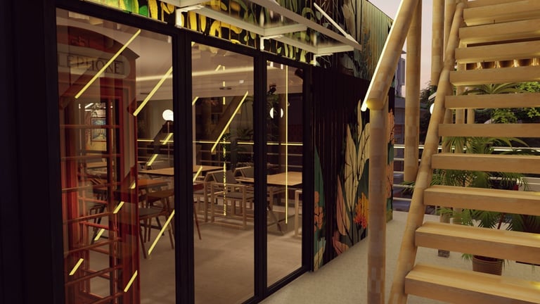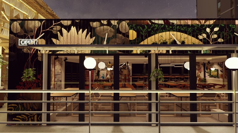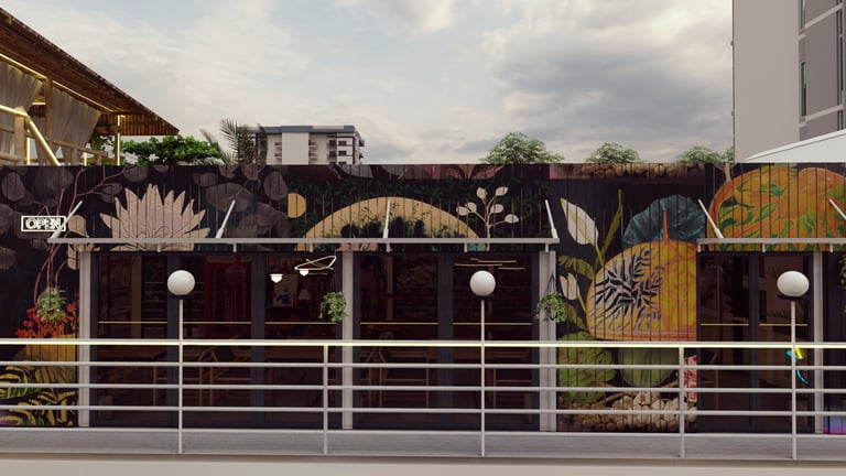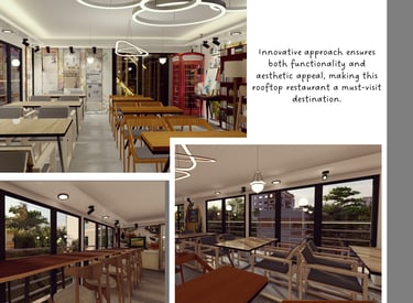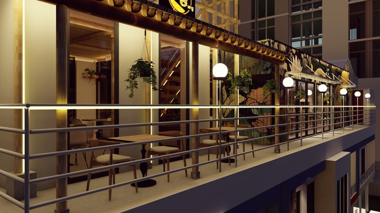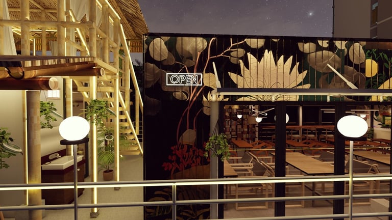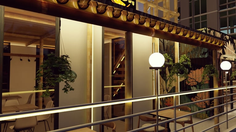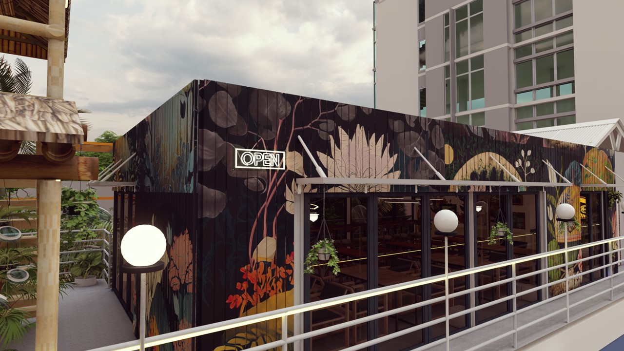 ADORA Studios has created a restaurant with a lightweight steel structure and insulation. The restaurant is on the rooftop of an old building with weak structural conditions; hence, it uses lightweight structures. The design boasts a modernistic look, complemented by stunning graffiti artwork on the wall. Combining the lightweight materials and the artistic elements creates a unique and visually striking ambiance for patrons to enjoy their dining experience. ADORA Studios’ innovative approach ensures functionality and aesthetic appeal, making this rooftop restaurant a must-visit destination.