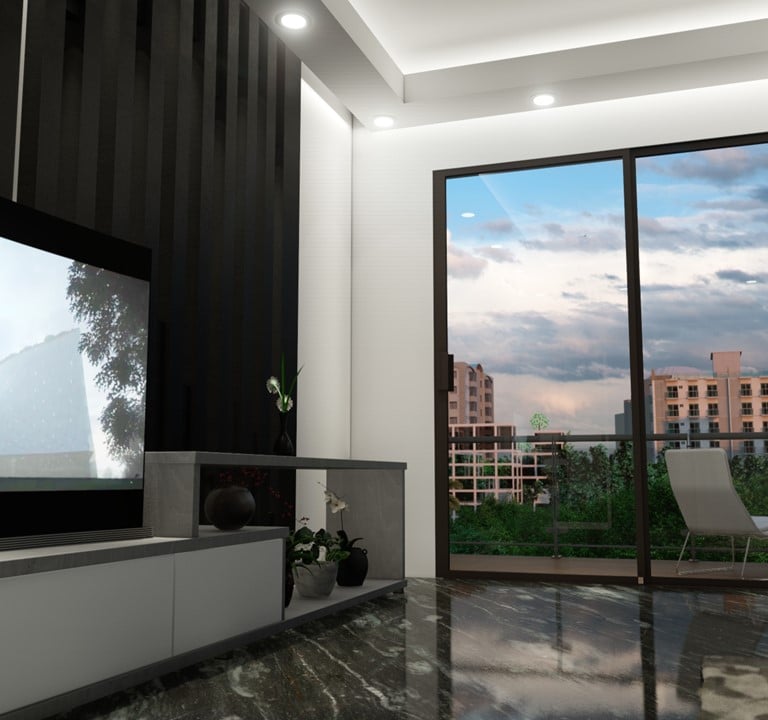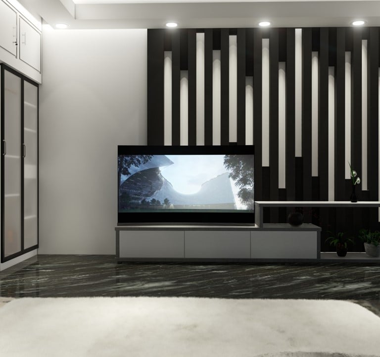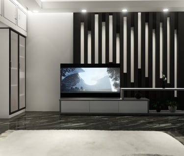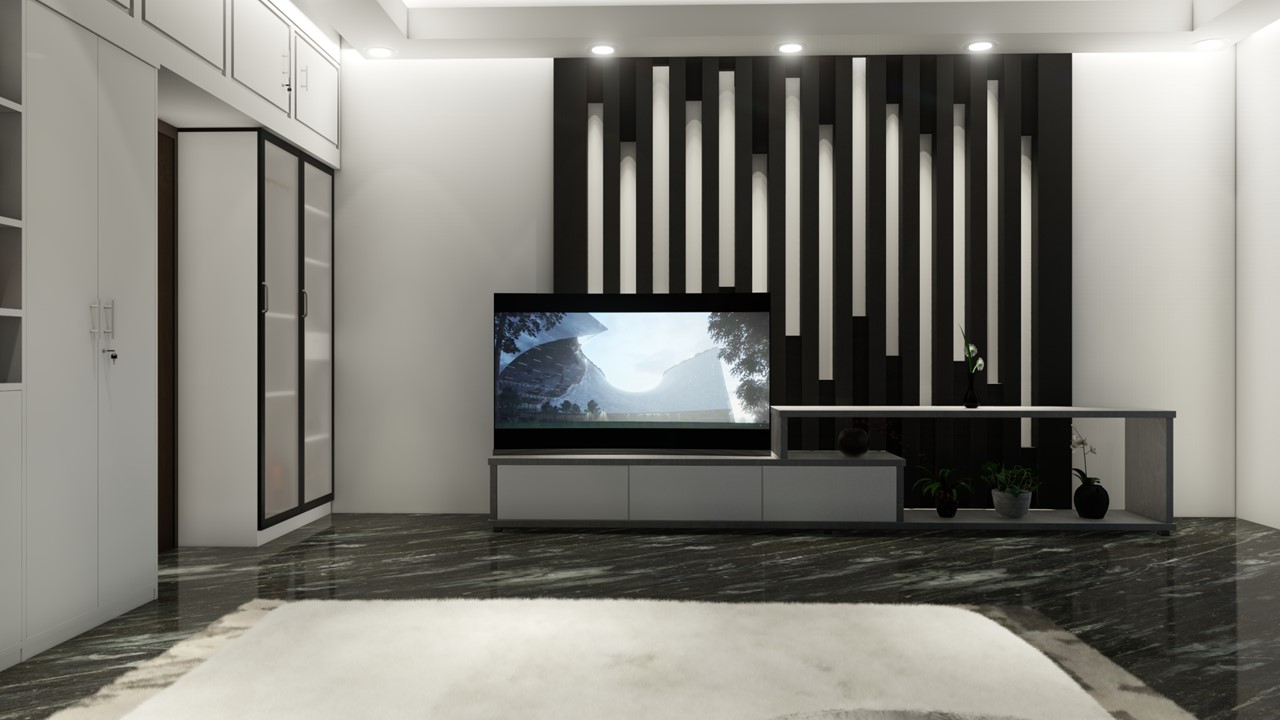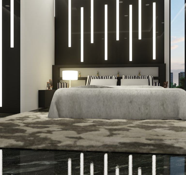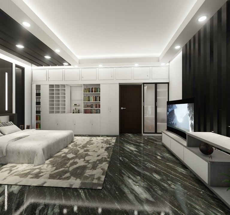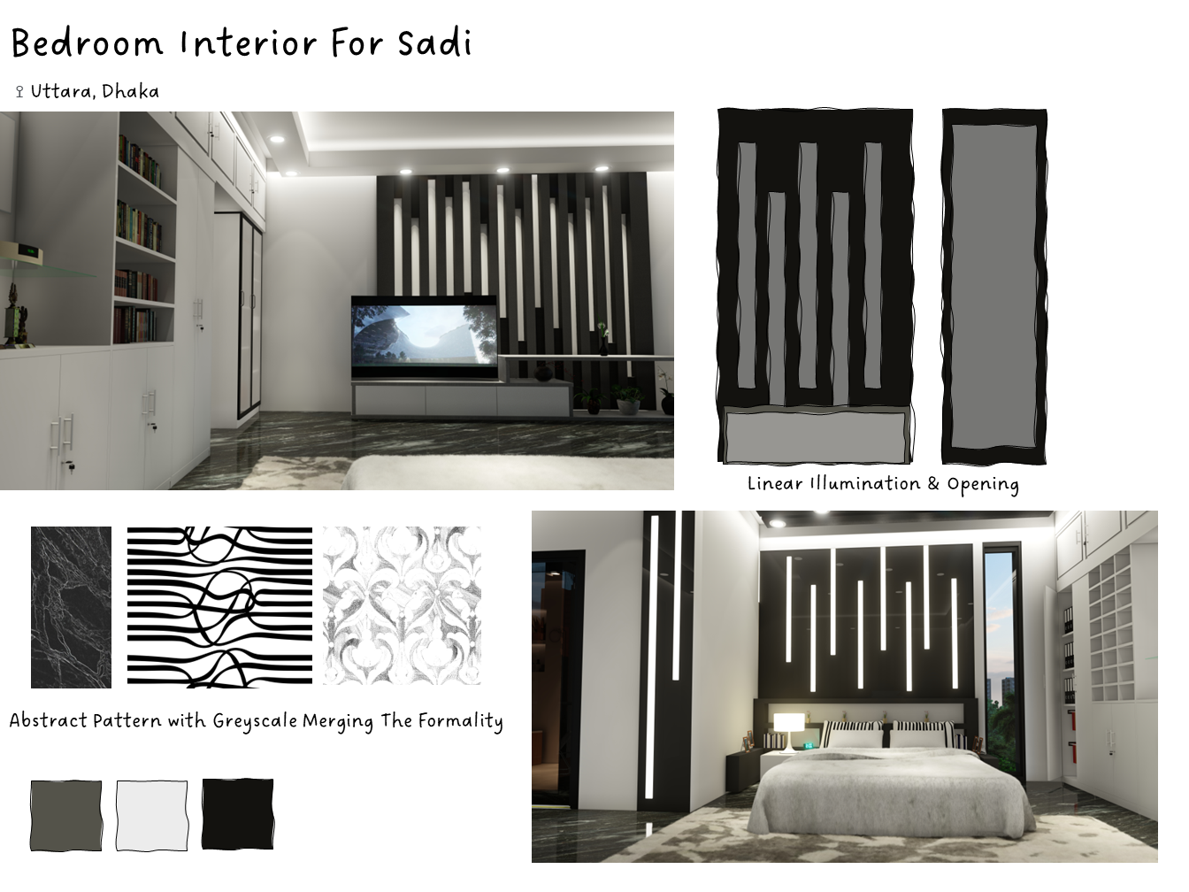Our client's master bedroom in his apartment in Uttara, Dhaka, Bangladesh, showcases a stunning interior design. With a black-and-white color scheme, the room exudes elegance and sophistication. The black granite floor adds a touch of luxury, while the American rug carpet brings warmth and comfort. Linear elements in the design further enhance the modern aesthetic of the room. Combining these features creates a harmonious and inviting space for our clients to relax and unwind.