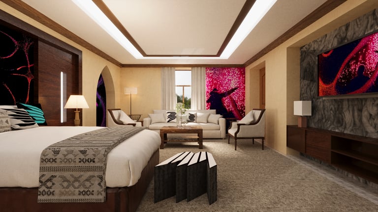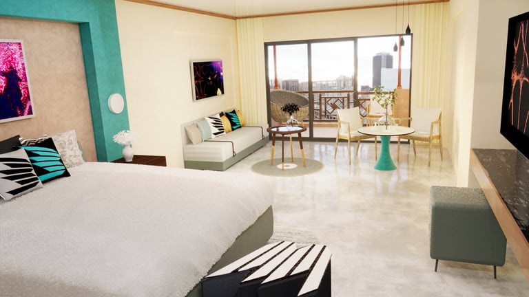 ADORA Studios collaborated with CRATER and Lightblue, two Dubai-based advertising and experience firms, to renovate the Hotel Rooms in Riyadh, Saudi Arabia, for MDLBeast Soundstorm 2023. The renovation focused on creating an immersive environment for festival-goers, blending the distinct design philosophies. The bold, textured elements and sleek, modern aesthetics with a soft color palette. The result is a space that balances edgy, innovative design with serene tones, perfectly capturing the dynamic and vibrant spirit of the MDLBeast Soundstorm festival.