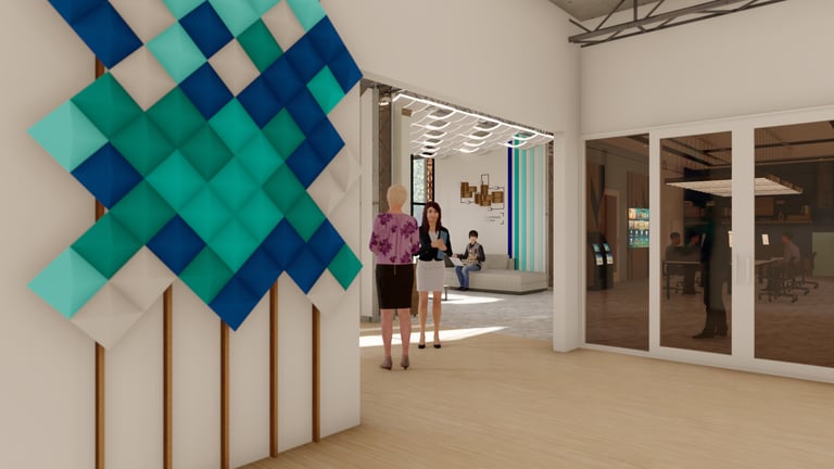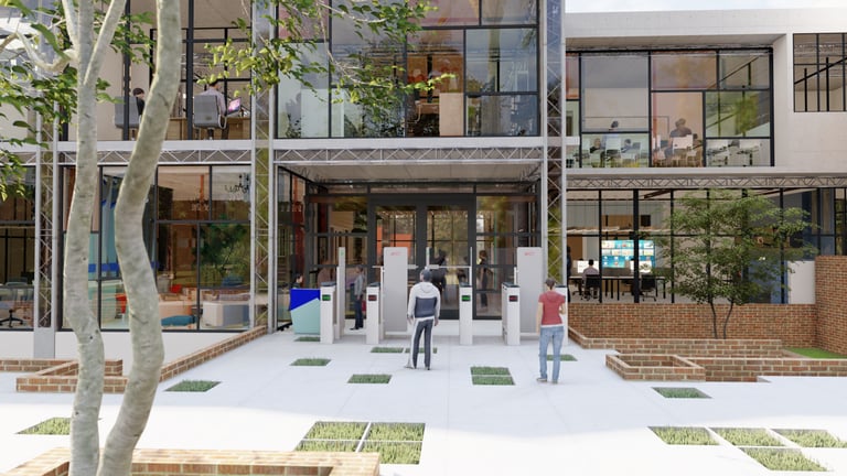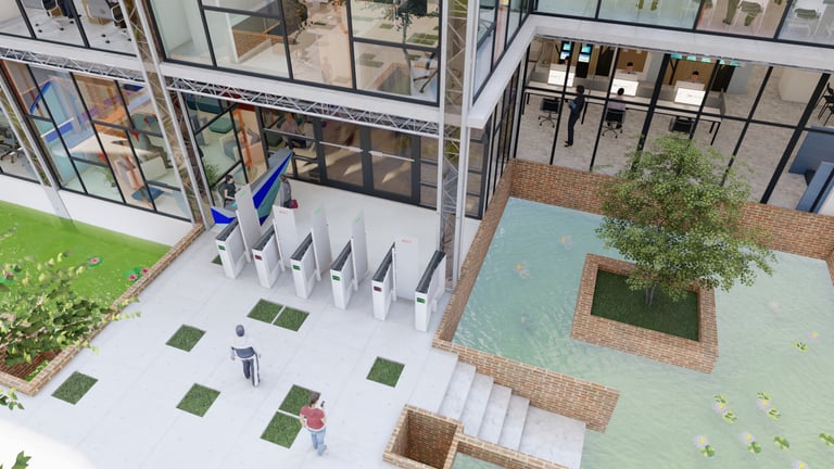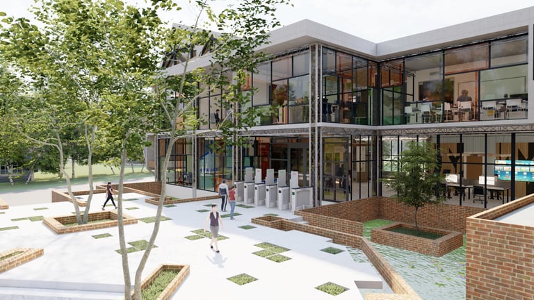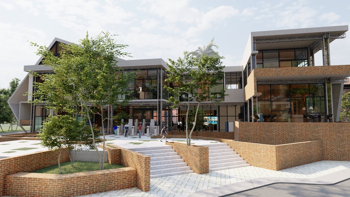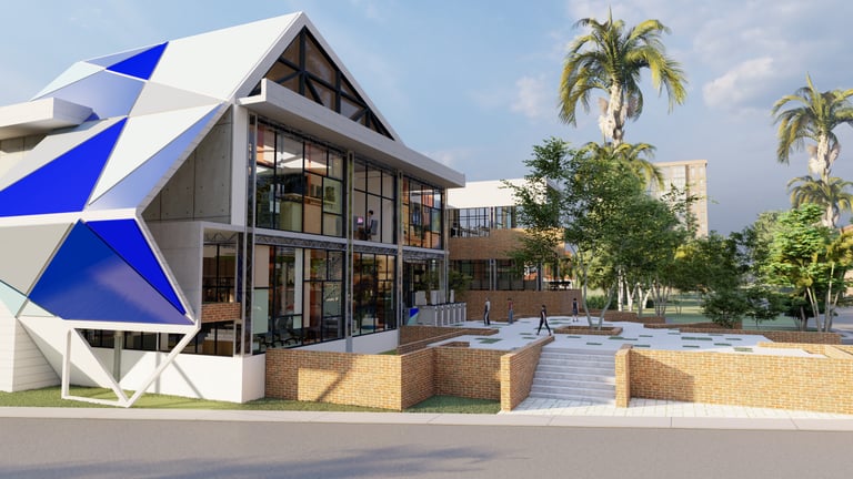 The Head Hub is a modern two-story building with a distinct geometric façade that integrates bold triangular forms, featuring striking blue and white panels. The large glass windows emphasize transparency, allowing natural light to flood the interior spaces and create a seamless connection between the indoors and outdoors. The structure’s clean lines and angular roof give it a contemporary feel, while the brickwork around the base adds warmth and grounding to the design. The exterior staircase and terraced landscaping create a welcoming entry point, blending the building harmoniously with its green surroundings. The design balances modern aesthetics with functionality, reflecting its role as a creative and collaborative space.