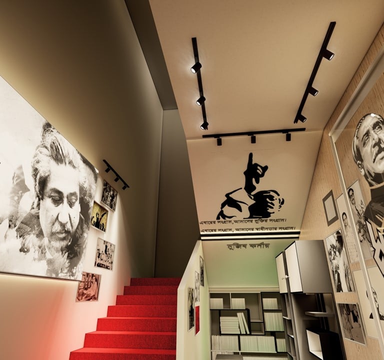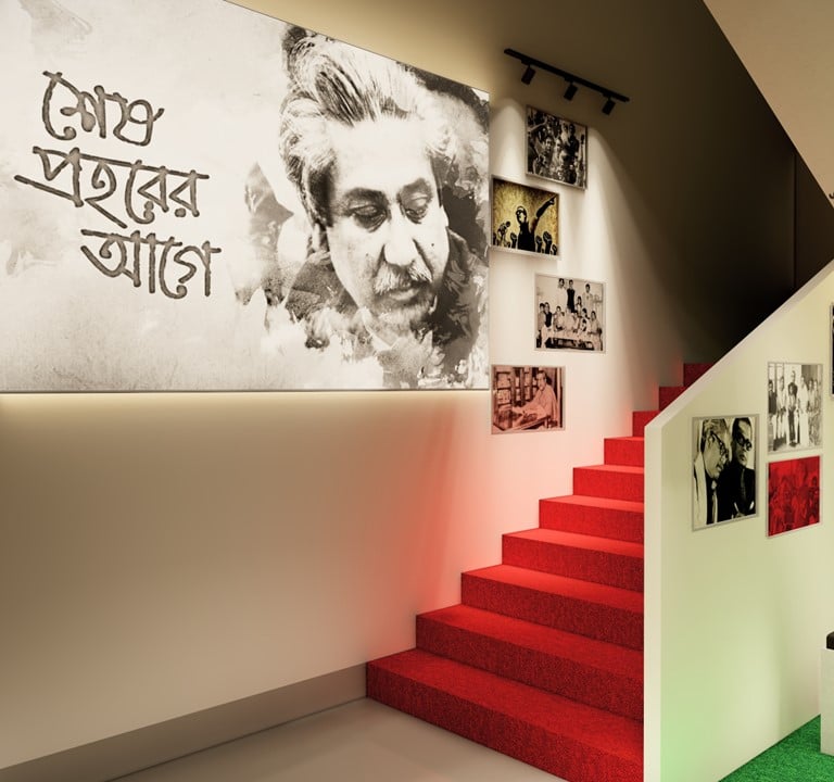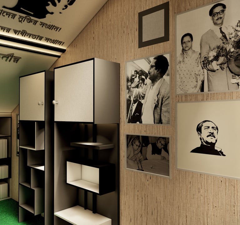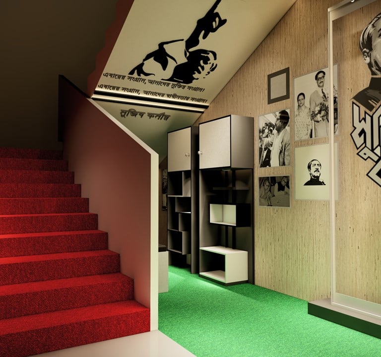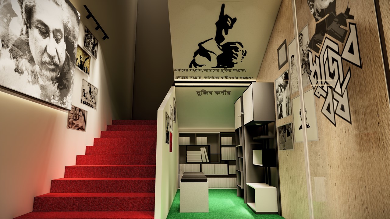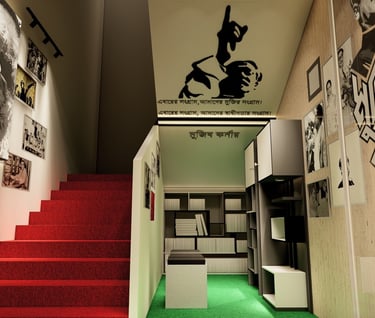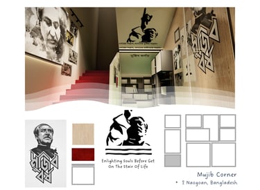 ADORA Studios has recently proposed an innovative proposal to establish Mujib Corner in a narrow and crowded staircase area. We aimed to create a serene reading corner that would serve as a source of enlightenment for all individuals, providing valuable knowledge about Sheikh Mujibar Rahman, the revered father of our nation. This proposal was meticulously designed to ensure the space is inviting and conducive to quiet reflection and learning. By incorporating comfortable seating, shelves filled with informative books, and aesthetically pleasing decor, our vision is to inspire individuals to delve into the life and accomplishments of this remarkable leader. Through the creation of Mujib Corner, we hope to pay homage to Sheikh Mujibur Rahman's legacy and inspire a sense of pride and curiosity among visitors.