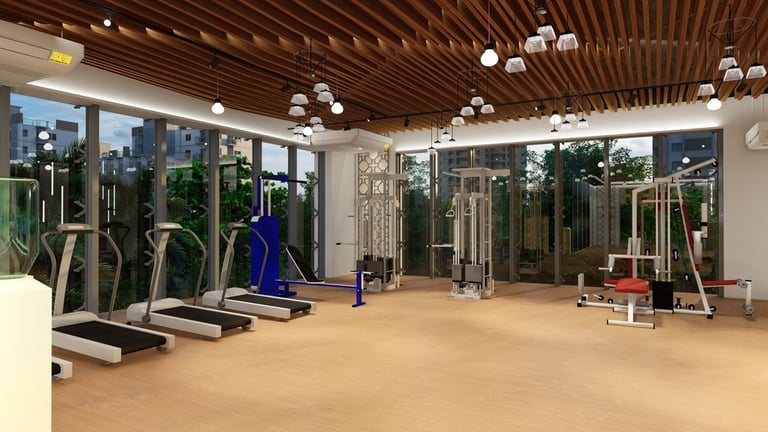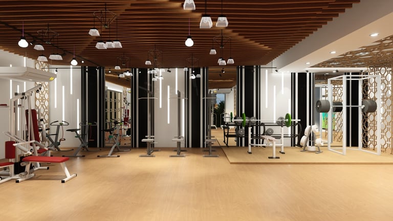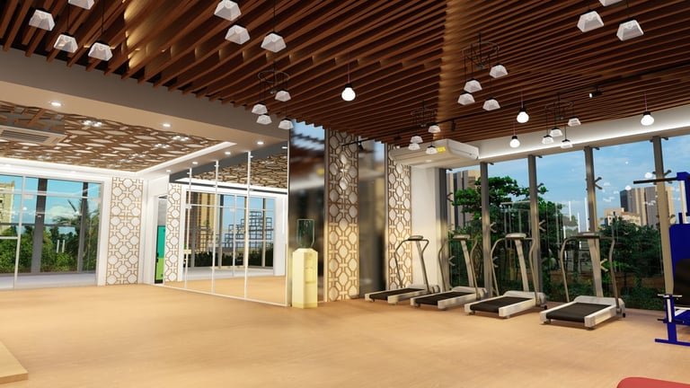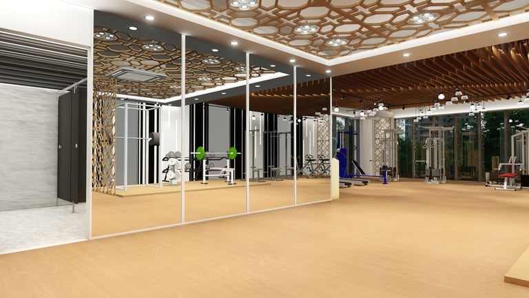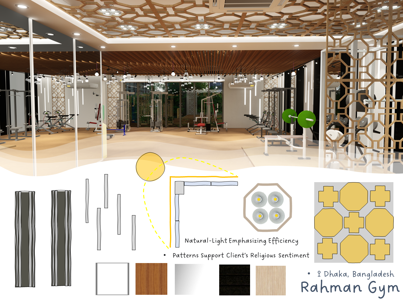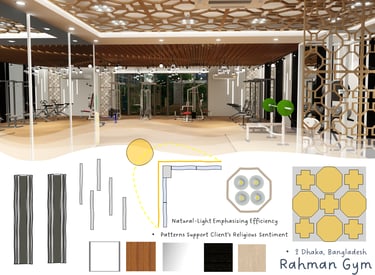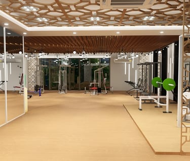 Rahman Gym is located in Dhaka, Bangladesh, designed and constructed by ADORA Studios. The gym features a beautiful wooden interior with fireproof insulation, ensuring safety and comfort for its members. The large glass panels allow ample daylight to flood the space, creating a bright and inviting atmosphere. Additionally, the gym incorporates Islamic pattern designs, which add aesthetic appeal and align with the clients' sentimental values. These features make ADORA a unique and visually appealing fitness facility where individuals can work out and achieve their health goals in a comfortable and inspiring environment.